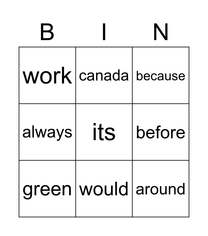 This bingo card has a free space and 8 words: before, because, canada, green, work, around, always and would.