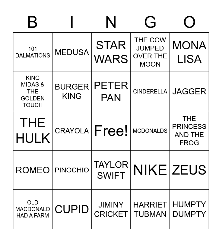 This bingo card has a free space and 24 words: PINOCHIO, CUPID, PETER PAN, OLD MACDONALD HAD A FARM, MONA LISA, 101 DALMATIONS, KING MIDAS & THE GOLDEN TOUCH, MEDUSA, MCDONALDS, TAYLOR SWIFT, CINDERELLA, THE HULK, NIKE, ZEUS, BURGER KING, HARRIET TUBMAN, THE PRINCESS AND THE FROG, STAR WARS, JAGGER, CRAYOLA, HUMPTY DUMPTY, ROMEO, THE COW JUMPED OVER THE MOON and JIMINY CRICKET.