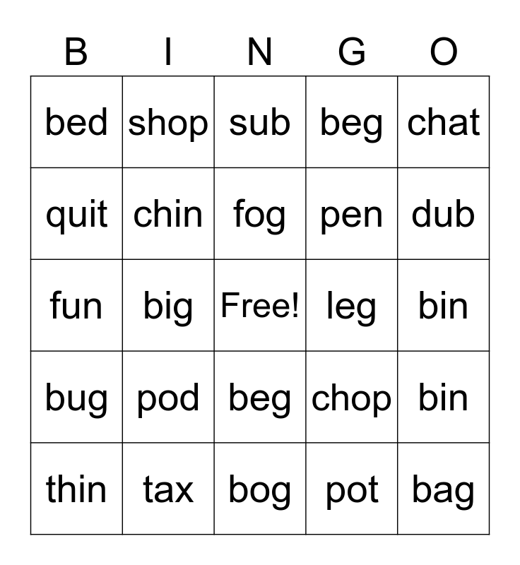 This bingo card has a free space and 24 words: pod, tax, fog, thin, chat, bed, quit, shop, leg, beg, pen, fun, chop, bin, chin, pot, bin, sub, dub, big, bag, bug, beg and bog.