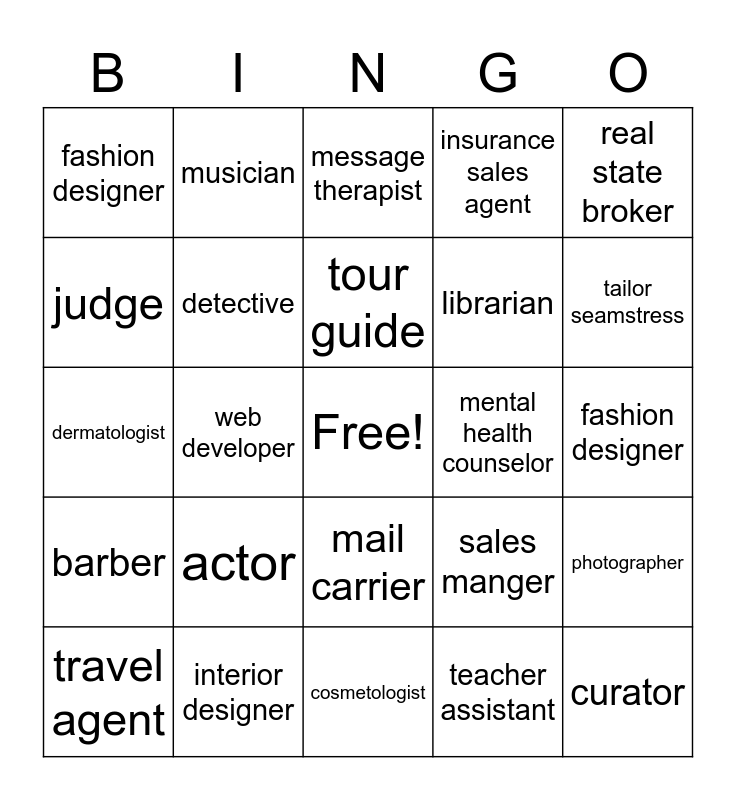 This bingo card has a free space and 24 words: actor, interior designer, tour guide, travel agent, real state broker, fashion designer, judge, musician, mental health counselor, mail carrier, librarian, dermatologist, sales manger, photographer, detective, teacher assistant, fashion designer, message therapist, tailor seamstress, web developer, curator, barber, insurance sales agent and cosmetologist.