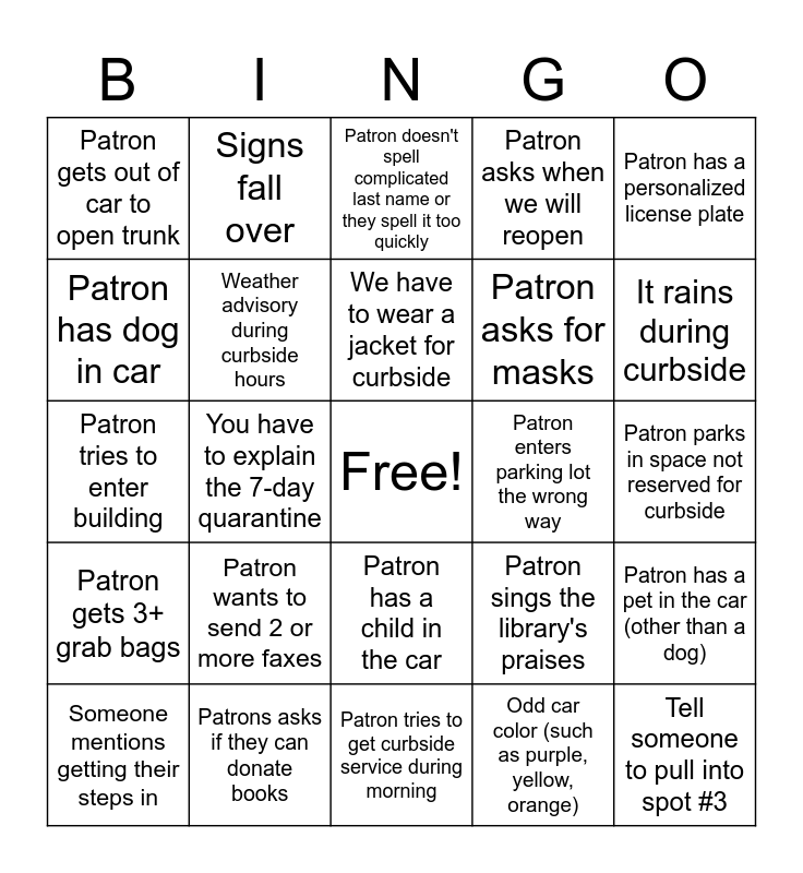 This bingo card has a free space and 35 words: Patron picks up 10+ holds from one card, Patron knocks on staff door, Patron has 0 holds here and/or holds at another branch, Weather advisory during curbside hours, Patron has a child in the car, Patron asks when we will reopen, Patron has dog in car, 3 of the same car in a row, We have to wear a jacket for curbside, Wildlife spotting (not birds or insects), Patron tries to enter building, Patron has a personalized license plate, Patron asks how to return books, We have a walk-up patron, Patron gets out of car to open trunk, Patron enters parking lot the wrong way, Odd car color (such as purple, yellow, orange), You have to explain the 7-day quarantine, Patron gets 3+ grab bags, Tell someone to pull into spot #3, Patron sings the library's praises, Someone mentions getting their steps in, Patron has a pet in the car (other than a dog), Patrons asks if they can donate books, Patron doesn't spell complicated last name or they spell it too quickly, It rains during curbside, It snows during curbside, Patron checks out a Launchpad, Patron asks for masks, Patron parks in space not reserved for curbside, Patron tells you how happy they are that we're open, Patron tries to get curbside service during morning, Patron wants to send 2 or more faxes, Signs fall over and Patron checks out items on 3+ library cards.