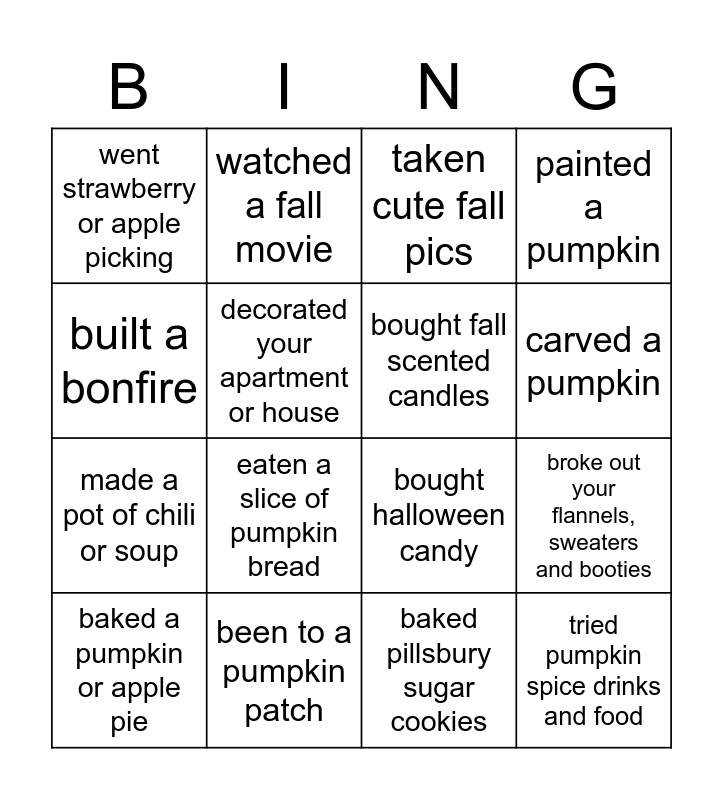 This bingo card has 16 words: been to a pumpkin patch, broke out your flannels, sweaters and booties, taken cute fall pics, went strawberry or apple picking, made a pot of chili or soup, watched a fall movie, bought halloween candy, baked pillsbury sugar cookies, built a bonfire, decorated your apartment or house, baked a pumpkin or apple pie, painted a pumpkin, eaten a slice of pumpkin bread, carved a pumpkin, bought fall scented candles and tried pumpkin spice drinks and food.