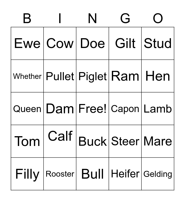 This bingo card has a free space and 24 words: Calf, Rooster, Piglet, Filly, Stud, Ewe, Whether, Cow, Capon, Buck, Ram, Queen, Steer, Mare, Pullet, Heifer, Lamb, Doe, Hen, Dam, Gelding, Tom, Gilt and Bull.