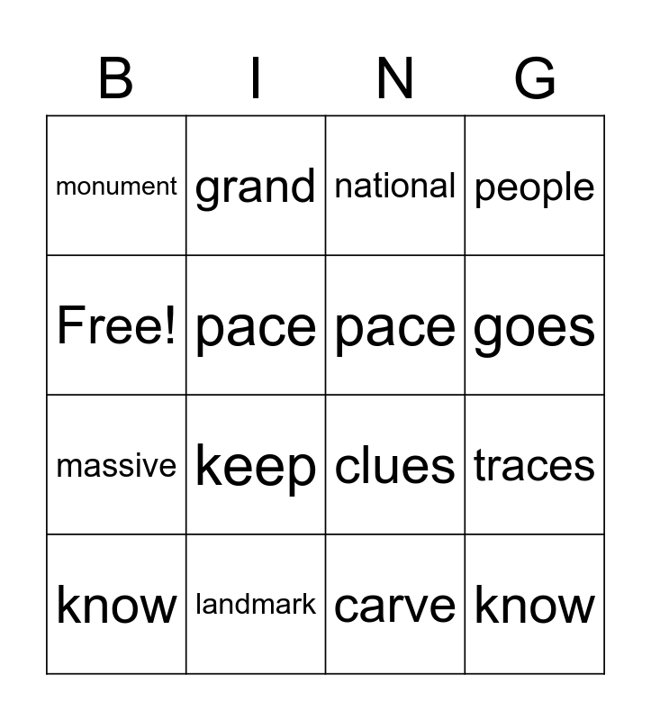 This bingo card has 16 words: landmark, traces, national, monument, massive, grand, clues, carve, Free!, pace, know, people, keep, goes, pace and know.