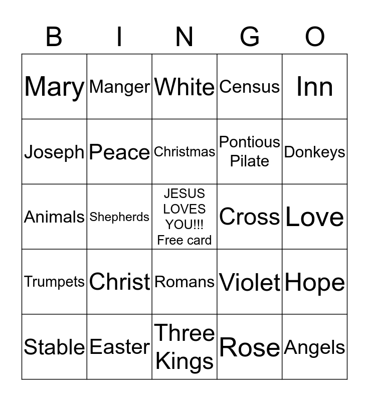 This bingo card has a free space and 24 words: Christ, Easter, Christmas, Stable, Inn, Mary, Joseph, Manger, Cross, Romans, Pontious Pilate, Animals, Violet, Hope, Peace, Rose, Love, White, Donkeys, Shepherds, Angels, Trumpets, Census and Three Kings.