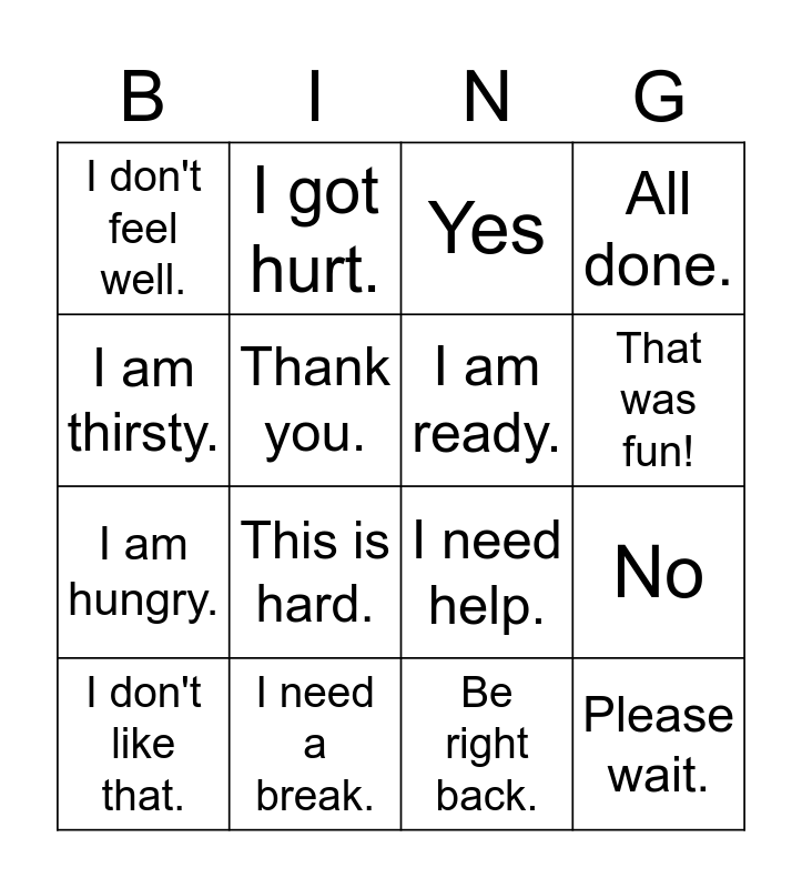 This bingo card has 16 words: I need a break., No, Yes, I don't feel well., I am hungry., I got hurt., I need help., Be right back., I am thirsty., Thank you., I don't like that., All done., This is hard., That was fun!, I am ready. and Please wait..