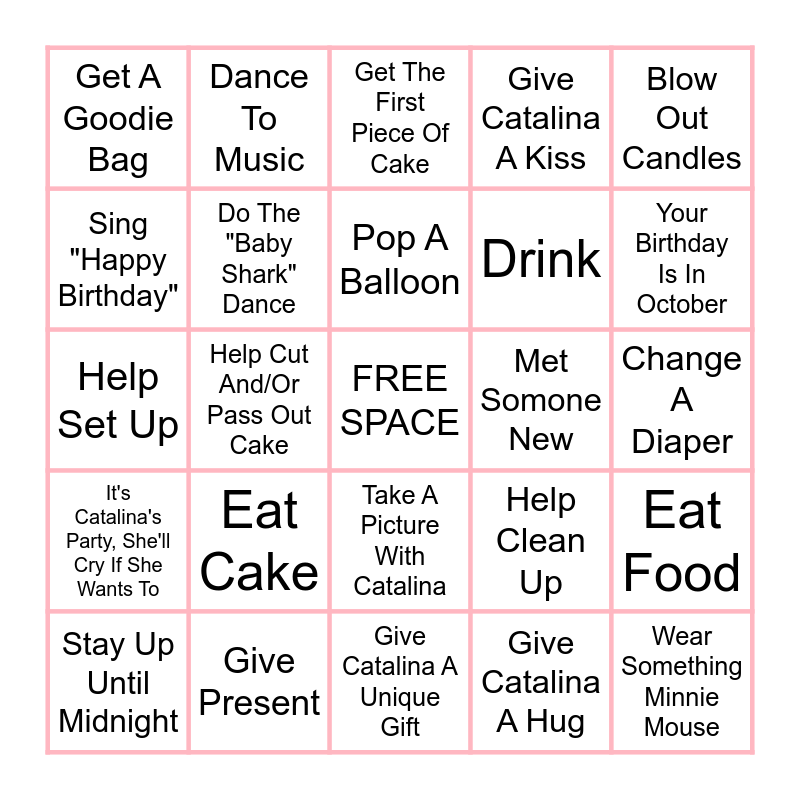 This bingo card has a free space and 24 words: Eat Cake, Give Present, Pop A Balloon, Stay Up Until Midnight, Blow Out Candles, Get A Goodie Bag, Sing "Happy Birthday", Dance To Music, Met Somone New, Take A Picture With Catalina, Drink, Help Set Up, Help Clean Up, Eat Food, Do The "Baby Shark" Dance, Give Catalina A Hug, Change A Diaper, Get The First Piece Of Cake, Your Birthday Is In October, Help Cut And/Or Pass Out Cake, Wear Something Minnie Mouse, It's Catalina's Party, She'll Cry If She Wants To, Give Catalina A Kiss and Give Catalina A Unique Gift.