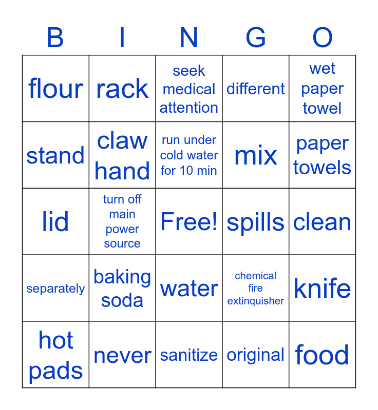 This bingo card has a free space and 33 words: Dry, unplug, turn off main power source, sharp, separately, claw hand, wet paper towel, hot pads, rack, pan handles, run under cold water for 10 min, seek medical attention, run, step stool, spills, paper towels, never, lid, baking soda, chemical fire extinquisher, water, sugar, flour, clean, sanitize, food, different, mix, stand, knife, pain, original and Ms. McLean.