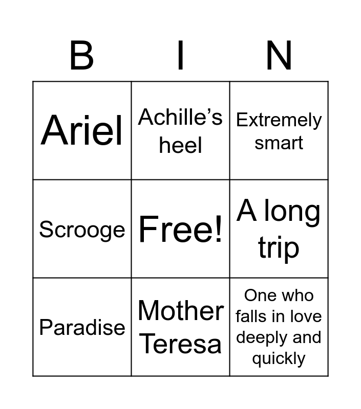 This bingo card has a free space and 9 words: Paradise, Extremely smart, Achille’s heel, Scrooge, Ariel, A long trip, One who falls in love deeply and quickly, Pandora’s Box and Mother Teresa.