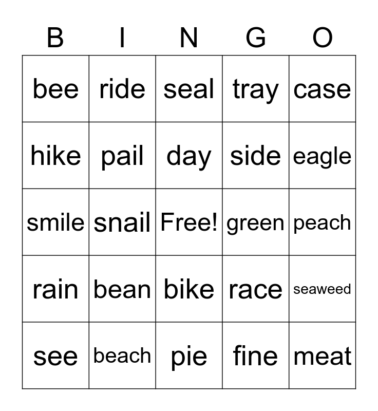 This bingo card has a free space and 36 words: cake, wake, bake, pail, race, rain, day, lake, case, wait, snail, tray, sheep, green, eagle, bee, eat, bean, meat, seal, peach, seaweed, beach, see, pie, ride, smile, pine, side, hike, pile, tie, fine, bike, lie and line.