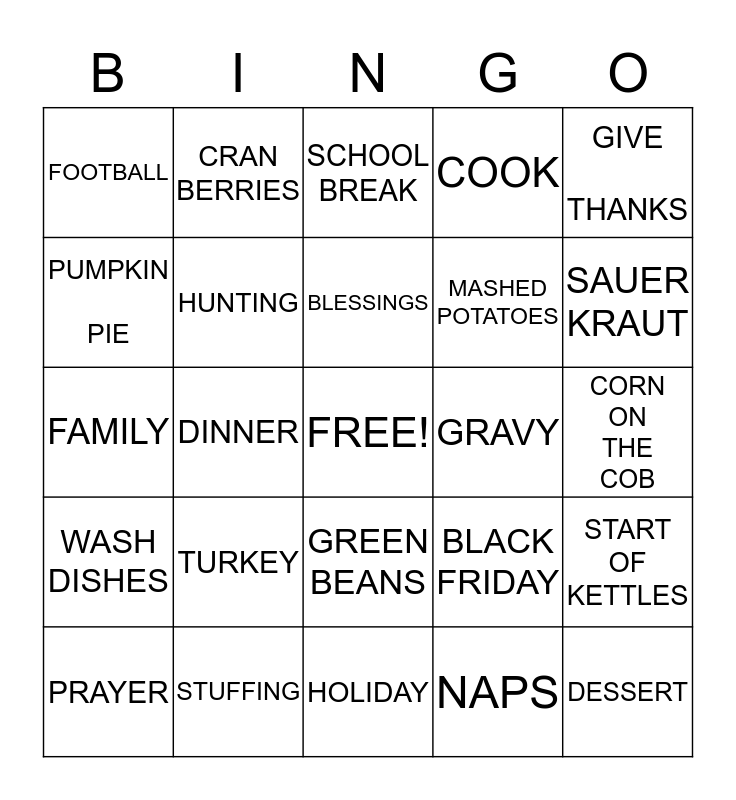 This bingo card has a free space and 24 words: TURKEY, STUFFING, BLESSINGS, PRAYER, GIVE THANKS, FOOTBALL, PUMPKIN PIE, CRAN BERRIES, GRAVY, GREEN BEANS, MASHED POTATOES, FAMILY, BLACK FRIDAY, START OF KETTLES, HUNTING, NAPS, CORN ON THE COB, SCHOOL BREAK, SAUER KRAUT, DINNER, DESSERT, WASH DISHES, COOK and HOLIDAY.