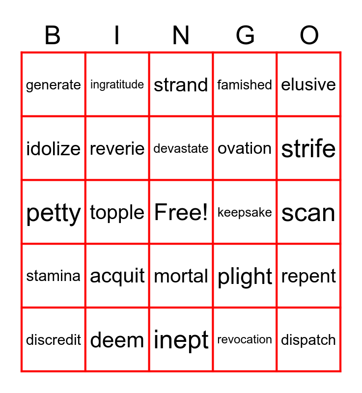 This bingo card has a free space and 24 words: acquit, deem, devastate, discredit, elusive, generate, idolize, ingratitude, keepsake, mortal, ovation, petty, plight, repent, reverie, revocation, scan, strand, strife, topple, dispatch, stamina, famished and inept.
