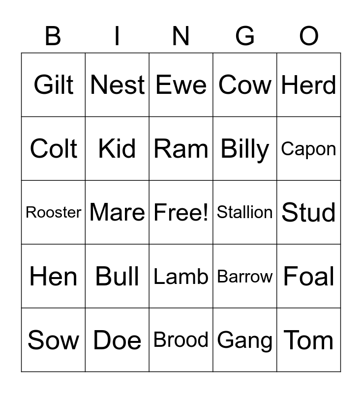 This bingo card has a free space and 24 words: Bull, Doe, Ram, Sow, Herd, Gilt, Colt, Nest, Stallion, Lamb, Billy, Rooster, Barrow, Foal, Kid, Gang, Stud, Ewe, Capon, Mare, Tom, Hen, Cow and Brood.