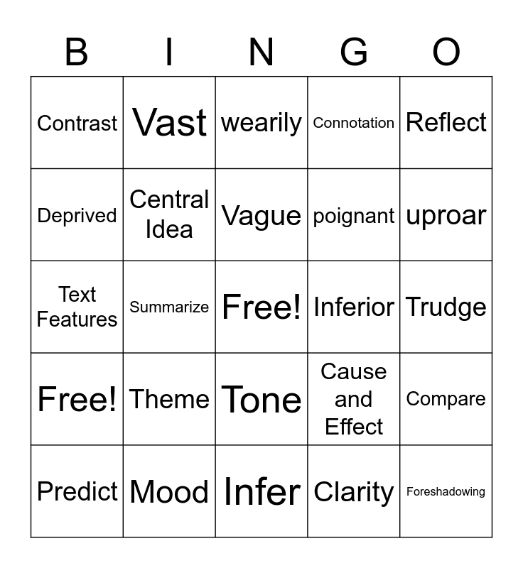 This bingo card has a free space and 24 words: Theme, Mood, Vague, Predict, Reflect, Contrast, Deprived, Vast, Inferior, Tone, poignant, Text Features, Cause and Effect, Compare, Central Idea, Clarity, Trudge, wearily, uproar, Summarize, Foreshadowing, Free!, Connotation and Infer.