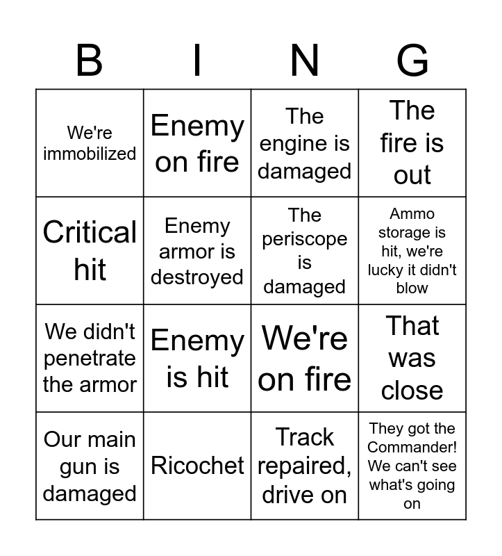This bingo card has 16 words: Ricochet, That was close, The engine is damaged, We're immobilized, We didn't penetrate the armor, Enemy on fire, We're on fire, Track repaired, drive on, Critical hit, Enemy armor is destroyed, Our main gun is damaged, The fire is out, Enemy is hit, Ammo storage is hit, we're lucky it didn't blow, The periscope is damaged and They got the Commander! We can't see what's going on.