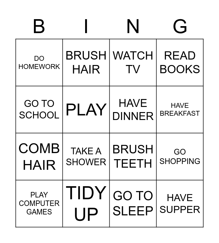 This bingo card has 16 words: TIDY UP, GO SHOPPING, WATCH TV, DO HOMEWORK, COMB HAIR, BRUSH HAIR, BRUSH TEETH, GO TO SLEEP, GO TO SCHOOL, PLAY, PLAY COMPUTER GAMES, READ BOOKS, TAKE A SHOWER, HAVE BREAKFAST, HAVE DINNER and HAVE SUPPER.
