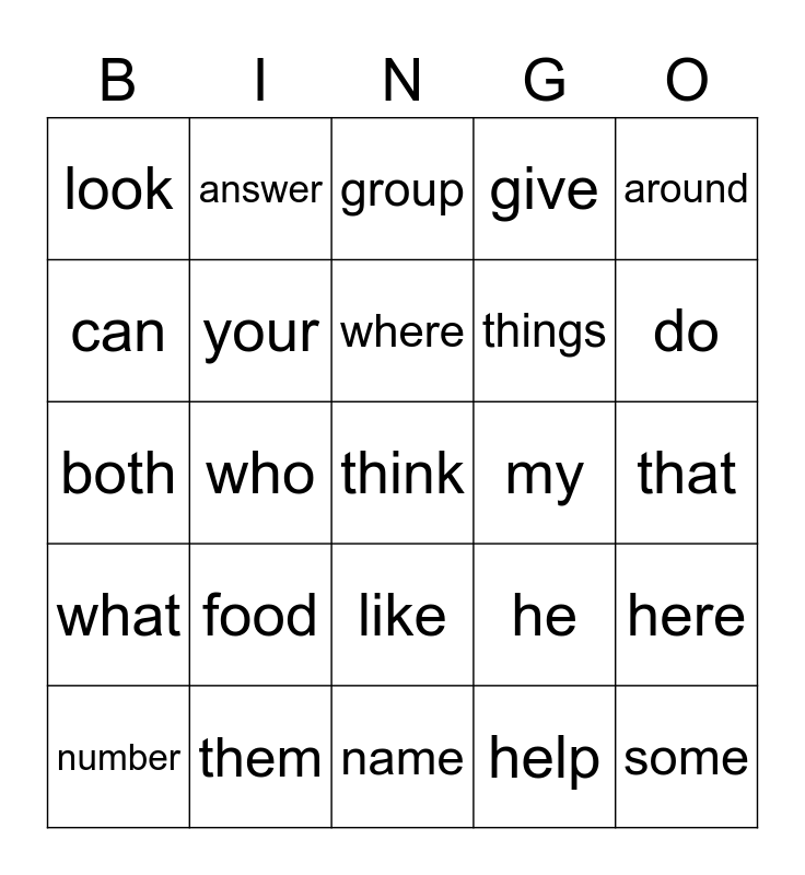 This bingo card has 25 words: food, name, where, number, around, look, can, answer, my, like, things, both, he, here, your, some, that, group, do, who, think, them, what, give and help.