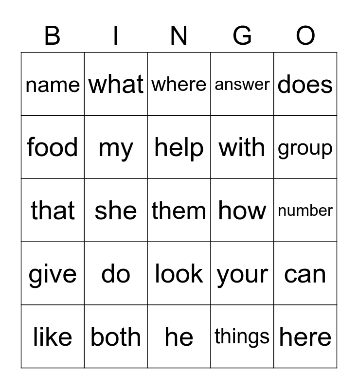This bingo card has 25 words: do, he, help, like, does, name, food, what, how, look, with, that, your, can, my, here, number, where, group, she, them, both, give, answer and things.