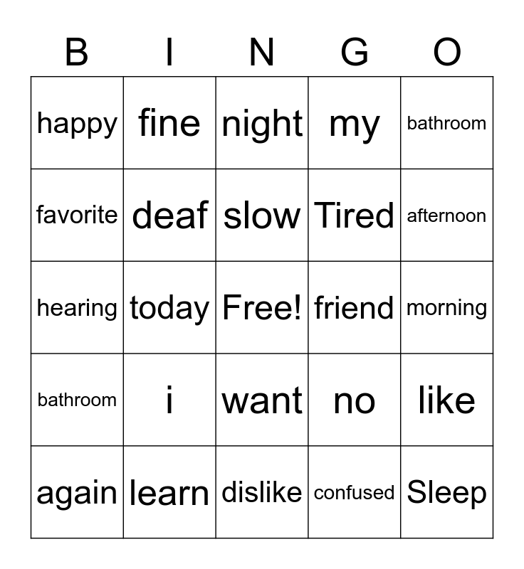 This bingo card has a free space and 24 words: again, i, slow, confused, bathroom, happy, fine, night, friend, morning, hearing, deaf, no, like, favorite, learn, dislike, my, afternoon, bathroom, today, want, Tired and Sleep.