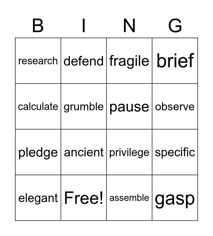 This bingo card has 16 words: Free!, specific, fragile, research, pledge, defend, privilege, assemble, calculate, grumble, elegant, brief, ancient, observe, pause and gasp.