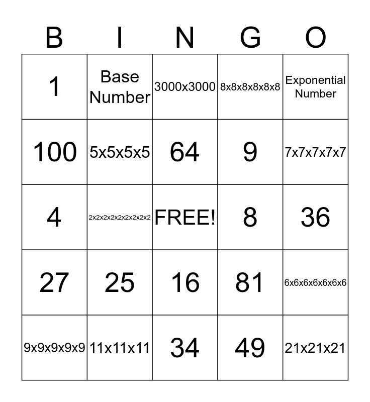 This bingo card has a free space and 24 words: 25, 11x11x11, 64, 9x9x9x9x9, Exponential Number, 1, 100, Base Number, 8, 16, 9, 4, 81, 6x6x6x6x6x6x6, 5x5x5x5, 49, 36, 3000x3000, 7x7x7x7x7, 2x2x2x2x2x2x2x2x2, 21x21x21, 27, 8x8x8x8x8x8 and 34.