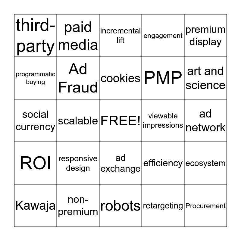This bingo card has a free space and 45 words: DMP, Procurement, KPI, Kawaja, buy-side, retargeting, incremental lift, RTB, premium display, non-premium, engagement, viewable impressions, ad exchange, responsive design, RFP, robots, mobile-first, social currency, privacy, art and science, paid media, yield management, big data, third-party, programmatic guaranteed, ad network, private exchange, native advertising, efficiency, ROI, platform, ecosystem, optimization, Lumascape, automated, scalable, transparency, DSP, digital strategy, cookies, programmatic buying, PMP, marketplace, Ad Fraud and viewability.