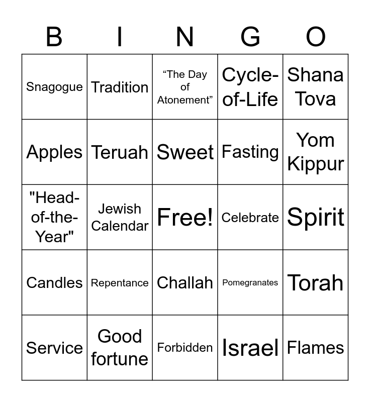 This bingo card has a free space and 35 words: Shofar, Tekiah, Shevarim, Teruah, Challah, Cycle-of-Life, Apples, Honey, Sweet, Healing, "Head-of-the-Year", Shana Tova, Ram's Horn, Jew Crew, Snagogue, Celebrate, Israel, Jewish Calendar, Candles, Flames, Pomegranates, Service, Torah, Good fortune, “The Day of Atonement”, Yom Kippur, 10 days of Awe, Machzor, Fasting, Spirit, “Sabbath of Sabbaths”, Forbidden, Repentance, Tradition and High Holy Days.