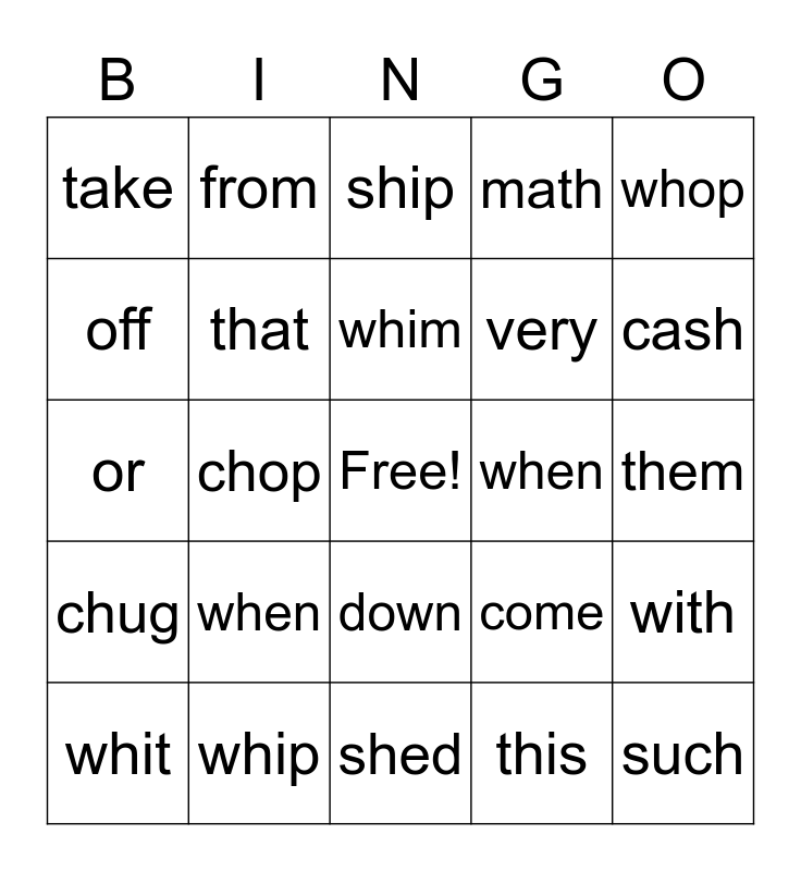 This bingo card has a free space and 24 words: when, whip, whim, whit, whop, take, off, from, when, down, very, or, come, with, that, this, them, ship, cash, chop, such, chug, math and shed.
