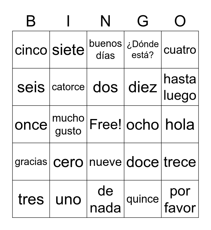 This bingo card has a free space and 24 words: cero, uno, dos, tres, cuatro, cinco, seis, siete, ocho, nueve, diez, once, doce, trece, catorce, quince, hola, buenos días, hasta luego, mucho gusto, por favor, gracias, ¿Dónde está? and de nada.