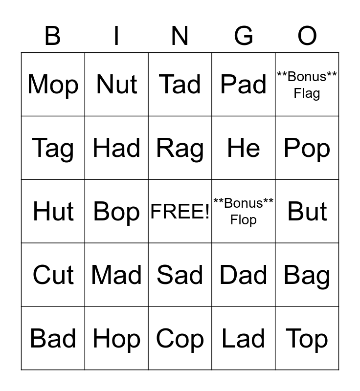 This bingo card has a free space and 24 words: Mad, Hop, Rag, Bad, **Bonus** Flag, Mop, Tag, Nut, **Bonus** Flop, Sad, He, Hut, Dad, Bag, Had, Lad, But, Tad, Pop, Bop, Top, Cut, Pad and Cop.