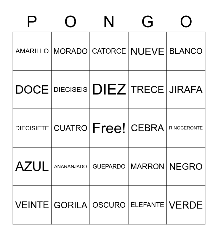 This bingo card has a free space and 44 words: ROJO, VERDE, ONCE, VEINTE, LEOPARDO, ELEFANTE, CATORCE, DOS, BLANCO, GORILA, NUEVE, CEBRA, GUEPARDO, ANARANJADO, DIECIOCHO, OSCURO, GRIS, DIECISIETE, CERO, JIRAFA, MORADO, TIGRE, CINCO, AMARILLO, HIPOPOTAMO, RINOCERONTE, LEON, CLARO, MARRON, AZUL, ROSADO, NEGRO, UNO, TRES, CUATRO, SEIS, SIETE, OCHO, DIEZ, DOCE, TRECE, QUINCE, DIECISEIS and DIECINUEVE.