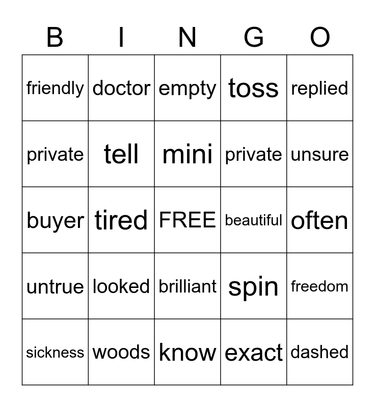 This bingo card has a free space and 24 words: looked, woods, mini, sickness, replied, friendly, private, doctor, beautiful, brilliant, private, buyer, spin, freedom, tell, exact, often, empty, unsure, tired, dashed, untrue, toss and know.
