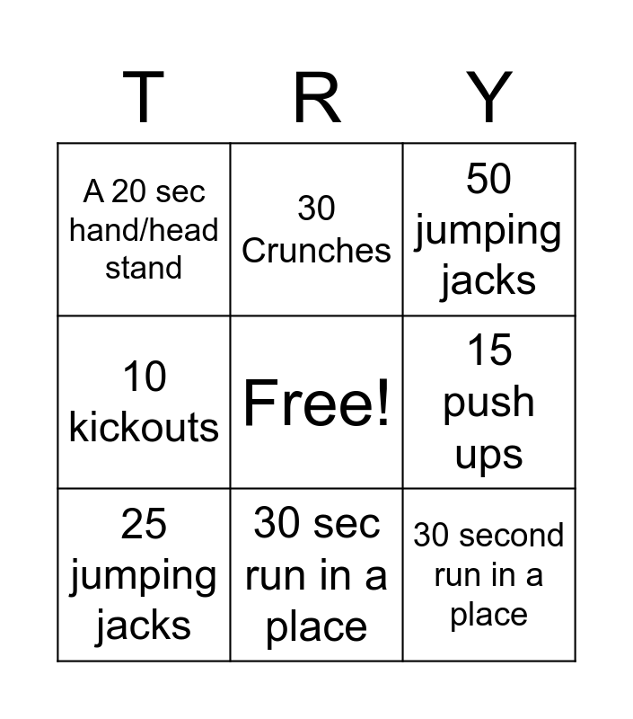 This bingo card has a free space and 9 words: 25 jumping jacks, 50 jumping jacks, 30 Crunches, 10 kickouts, A 20 sec hand/head stand, 15 push ups, 30 second run in a place, 10 front rolls and 30 sec run in a place.