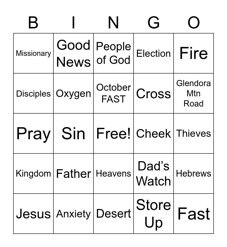 This bingo card has a free space and 27 words: Dad’s Watch, RLLA, Cross, Desert, Disciples, People of God, Good News, Kingdom, Cheek, Hebrews, Pray, Election, Jesus, Anxiety, Glendora Mtn Road, Voice of God, Oxygen, October FAST, Father, Missionary, Thieves, Store Up, Sin, Fast, Heavens, Fire and Meteor Shower.