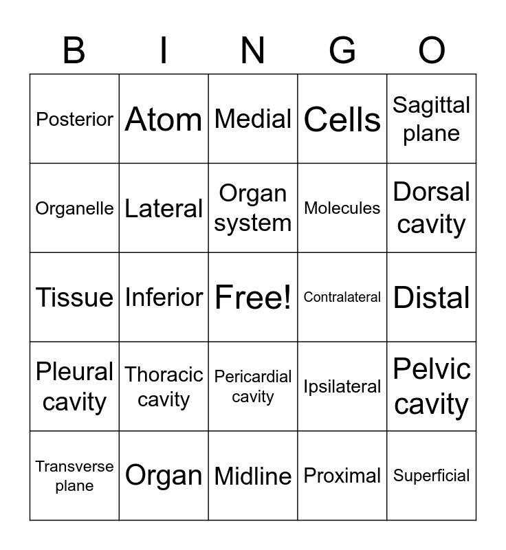 This bingo card has a free space and 31 words: Midline, Superior, Inferior, Anterior, Posterior, Medial, Lateral, Ipsilateral, Contralateral, Proximal, Distal, Superficial, Axial, Appendicular, Dorsal cavity, Abdominal cavity, Pelvic cavity, Thoracic cavity, Pleural cavity, Pericardial cavity, Sagittal plane, Frontal plane, Transverse plane, Atom, Molecules, Organelle, Cells, Tissue, Organ, Organ system and Organism.
