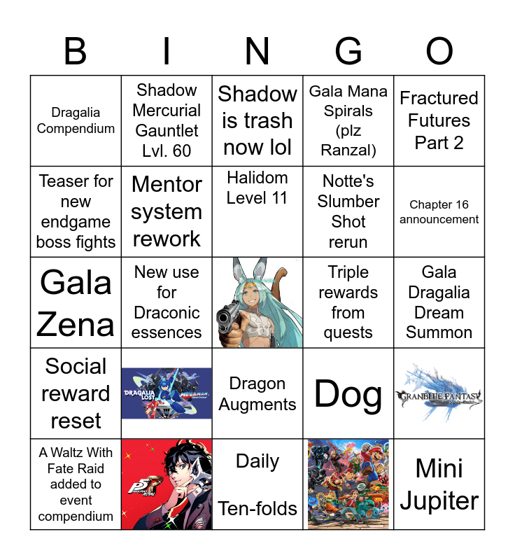 This bingo card has 4 images, a free space and 20 words: Halidom Level 11, A Waltz With Fate Raid added to event compendium, Fractured Futures Part 2, Dragalia Compendium, Teaser for new endgame boss fights, Shadow Mercurial Gauntlet Lvl. 60, Triple rewards from quests, Dragon Augments, Notte's Slumber Shot rerun, Gala Zena, Dog, Mentor system rework, Gala Dragalia Dream Summon, Shadow is trash now lol, Chapter 16 announcement, New use for Draconic essences, Mini Jupiter, Social reward reset, Gala Mana Spirals (plz Ranzal) and Daily Ten-folds.