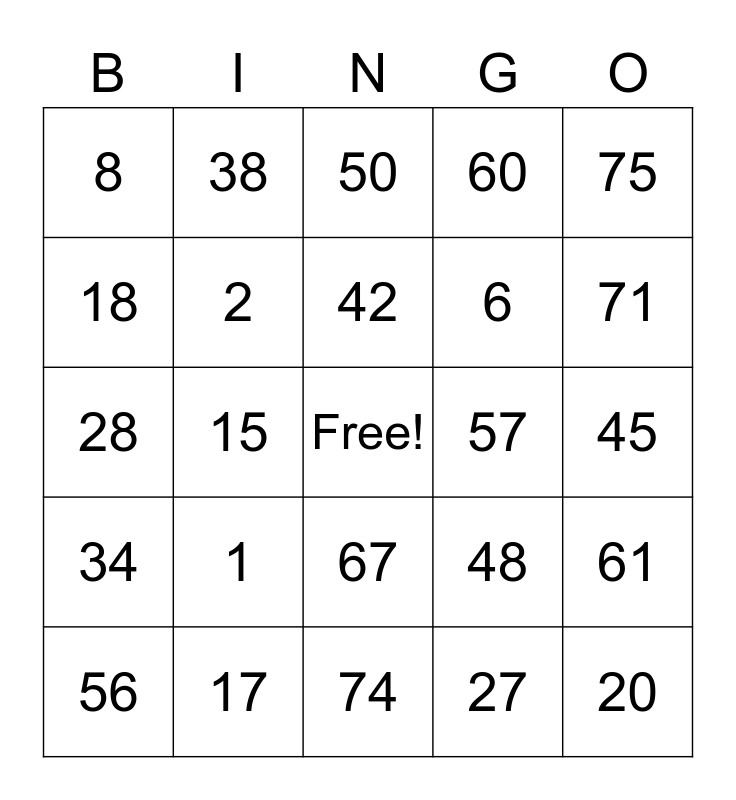 This bingo card has a free space and 24 words: 1, 17, 42, 56, 75, 8, 18, 38, 57, 67, 6, 28, 48, 61, 2, 27, 45, 50, 71, 15, 20, 34, 60 and 74.