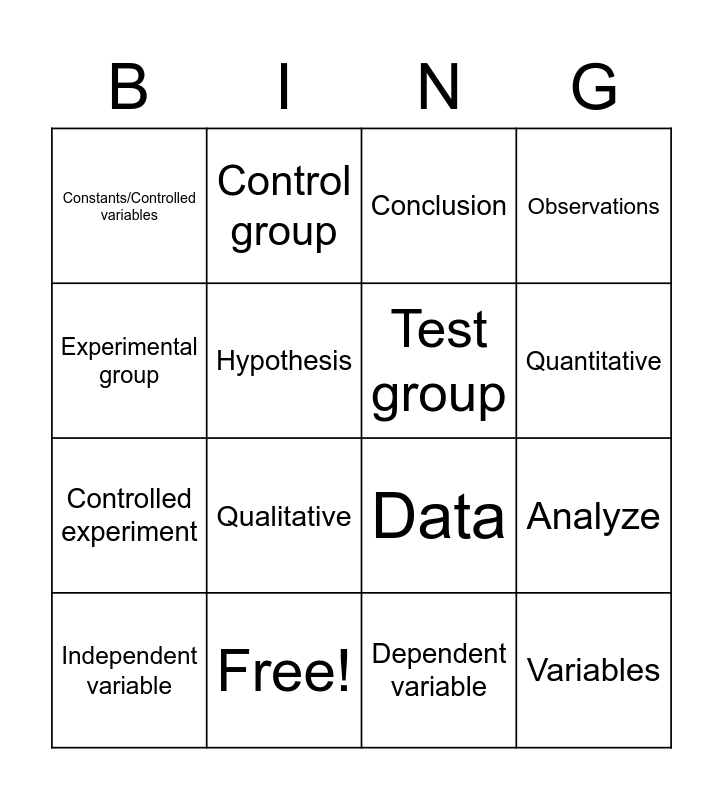 This bingo card has 16 words: Free!, Analyze, Conclusion, Constants/Controlled variables, Controlled experiment, Control group, Data, Dependent variable, Experimental group, Hypothesis, Independent variable, Observations, Qualitative, Quantitative, Test group and Variables.