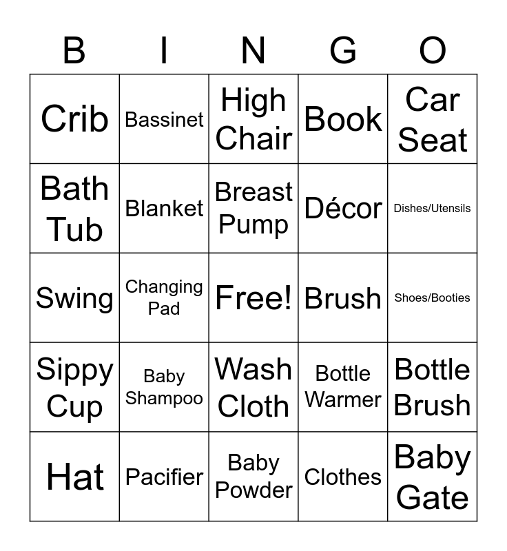 This bingo card has a free space and 51 words: Baby Carrier/Wrap, Baby Gate, Baby Lotion, Baby Powder, Baby Shampoo, Baby Wash, Bassinet, Bath Toy, Bath Tub, Bibs, Blanket, Book, Bottle Brush, Bottle Warmer, Bottles, Bouncer, Breast Pump, Brush, Burp Cloth, Car Seat, Changing Pad, Clothes, Crib, Décor, Diaper Rash Cream, Diapers, Dishes/Utensils, Gift for Mom, Hat, High Chair, Hooded Towel, Monitor, Nail Clippers, Nasal Aspirator, Nursey Bedding, Pacifier, Picture Frame, Play Gym, Rob, Sheets, Shoes/Booties, Sippy Cup, Socks, Storage/Organizer, Stroller, Stuffed Animal, Swing, Teether, Thermometer, Wash Cloth and Wipes.
