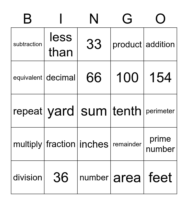 This bingo card has a free space and 24 words: fraction, 36, 66, division, addition, subtraction, equivalent, less than, tenth, inches, 100, repeat, remainder, prime number, decimal, area, perimeter, 33, 154, yard, feet, multiply, product and number.