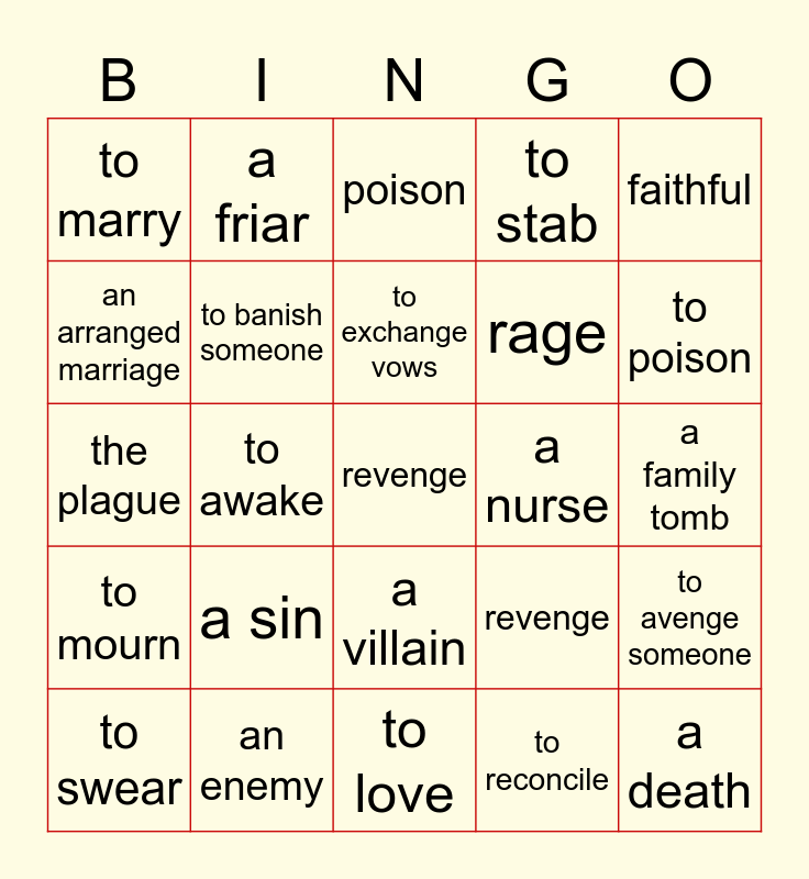 This bingo card has a free space and 24 words: a sin, an enemy, to exchange vows, to swear, faithful, to marry, an arranged marriage, a friar, a nurse, a villain, rage, the plague, revenge, to avenge someone, to banish someone, to reconcile, a family tomb, poison, to poison, to awake, a death, to mourn, to stab and to love.