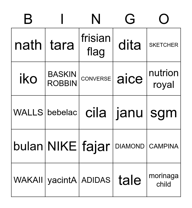 This bingo card has 25 words: NIKE, ADIDAS, CONVERSE, WAKAII, SKETCHER, nath, iko, tara, janu, fajar, aice, WALLS, DIAMOND, CAMPINA, BASKIN ROBBIN, morinaga child, sgm, frisian flag, nutrion royal, bebelac, cila, yacintA, bulan, dita and tale.