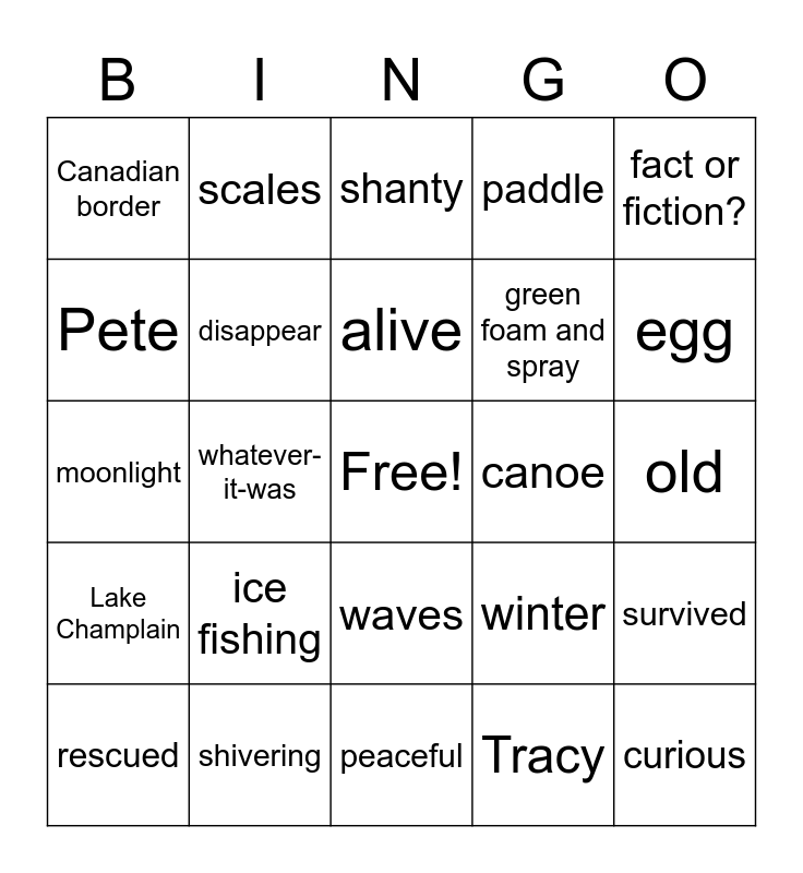 This bingo card has a free space and 24 words: ice fishing, shivering, alive, rescued, fact or fiction?, Canadian border, Pete, scales, canoe, waves, green foam and spray, moonlight, winter, survived, disappear, Tracy, old, shanty, egg, whatever-it-was, curious, Lake Champlain, paddle and peaceful.