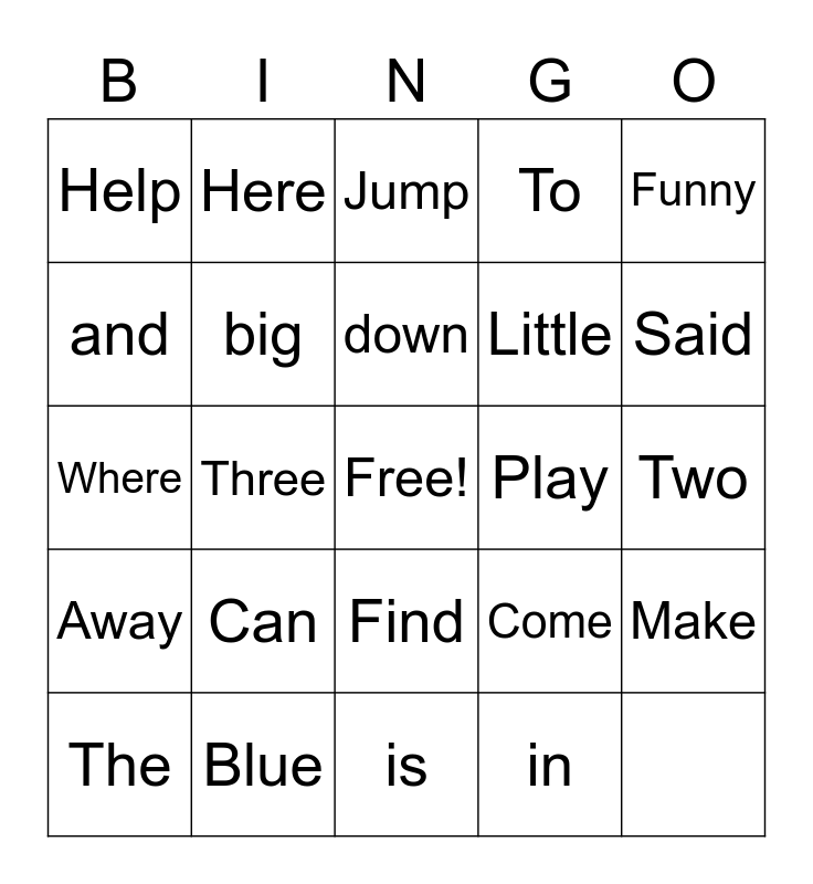 This bingo card has a free space and 24 words: Away, Blue, Find, Come, Funny, Help, Here, Jump, Little, Make, and, big, for, Play, Said, The, Three, down, To, Two, Where, Can, is and in.