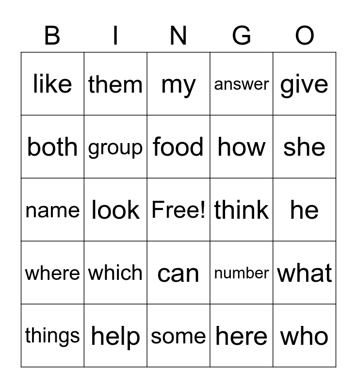 This bingo card has a free space and 24 words: which, help, food, things, give, like, both, them, think, can, how, name, number, what, group, here, he, my, she, look, who, where, answer and some.