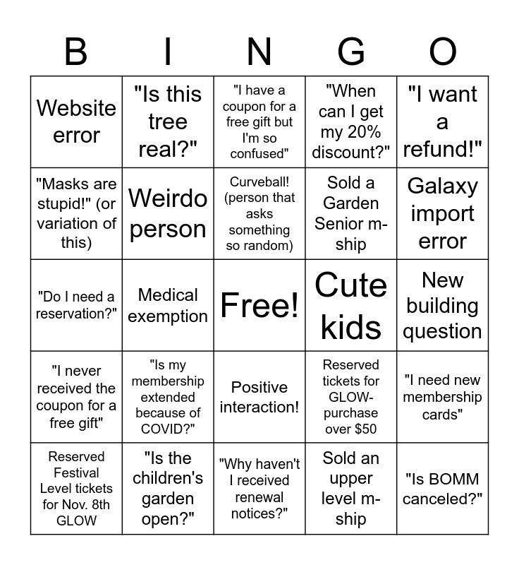 This bingo card has a free space and 24 words: Reserved Festival Level tickets for Nov. 8th GLOW, "Is my membership extended because of COVID?", Curveball! (person that asks something so random), Sold an upper level m-ship, "I want a refund!", Website error, "Is this tree real?", "I have a coupon for a free gift but I'm so confused", Cute kids, New building question, "Do I need a reservation?", Weirdo person, Reserved tickets for GLOW- purchase over $50, "I need new membership cards", "Masks are stupid!" (or variation of this), "Is the children's garden open?", "Why haven't I received renewal notices?", "When can I get my 20% discount?", Galaxy import error, "I never received the coupon for a free gift", Medical exemption, Positive interaction!, Sold a Garden Senior m-ship and "Is BOMM canceled?".