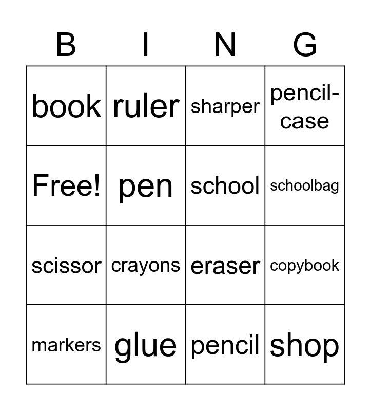 This bingo card has 16 words: glue, copybook, sharper, book, scissor, ruler, eraser, pencil, Free!, pen, markers, pencil-case, crayons, schoolbag, school and shop.
