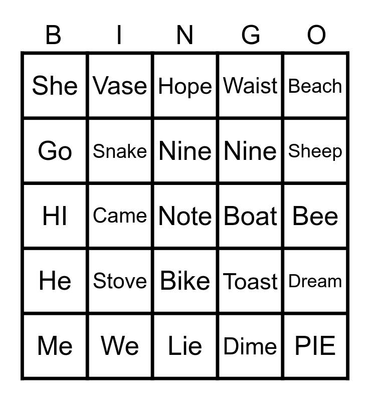 This bingo card has 25 words: He, We, Note, Dime, Beach, She, Vase, Hope, Boat, Dream, Go, Snake, Lie, Toast, Sheep, Me, Came, Nine, Nine, Bee, HI, Stove, Bike, Waist and PIE.