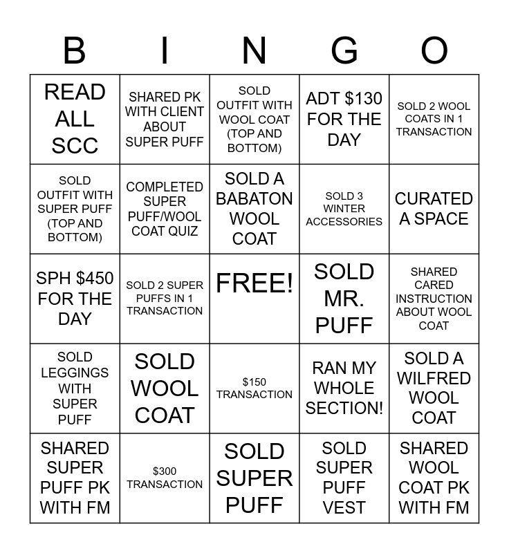 This bingo card has a free space and 24 words: SOLD WOOL COAT, $300 TRANSACTION, SOLD A BABATON WOOL COAT, SHARED SUPER PUFF PK WITH FM, SOLD 2 WOOL COATS IN 1 TRANSACTION, READ ALL SCC, SOLD OUTFIT WITH SUPER PUFF (TOP AND BOTTOM), SHARED PK WITH CLIENT ABOUT SUPER PUFF, SOLD MR. PUFF, $150 TRANSACTION, SOLD 3 WINTER ACCESSORIES, SPH $450 FOR THE DAY, RAN MY WHOLE SECTION!, SOLD A WILFRED WOOL COAT, COMPLETED SUPER PUFF/WOOL COAT QUIZ, SOLD SUPER PUFF VEST, SHARED CARED INSTRUCTION ABOUT WOOL COAT, SOLD OUTFIT WITH WOOL COAT (TOP AND BOTTOM), CURATED A SPACE, SOLD 2 SUPER PUFFS IN 1 TRANSACTION, SHARED WOOL COAT PK WITH FM, SOLD LEGGINGS WITH SUPER PUFF, ADT $130 FOR THE DAY and SOLD SUPER PUFF.