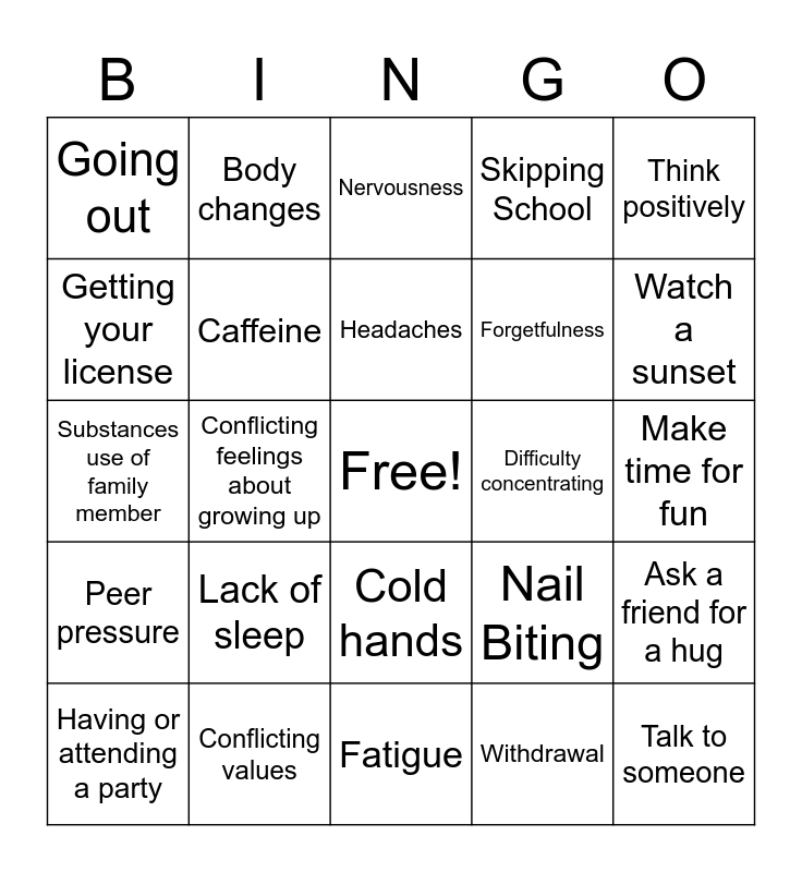 This bingo card has a free space and 24 words: Having or attending a party, Lack of sleep, Headaches, Withdrawal, Think positively, Going out, Body changes, Nervousness, Difficulty concentrating, Make time for fun, Substances use of family member, Caffeine, Nail Biting, Ask a friend for a hug, Getting your license, Conflicting values, Fatigue, Skipping School, Watch a sunset, Peer pressure, Conflicting feelings about growing up, Cold hands, Forgetfulness and Talk to someone.